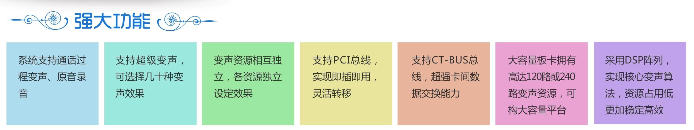 6. 大容量、高密度单块板卡拥有高达120路或240路的变声资源,为构建超大容量平台提供技术基础。